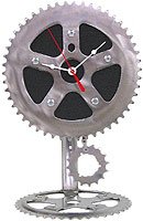 One of our classic designs, rumored to be on the desk of the curator of MOMA. A recycled bicycle chainring face seems to float above its base, but in reality it is elegantly suspended by a section of recycled bicycle wheel rim curled in our forge. Fun, swinging pendulum made from a recycled bicycle cog and chain section. The black face is made from recycled tire rubber. Takes one AA battery (included). 12" x 8" x 6".../ Recycled Bicycle Parts Desk Pendulum Clock / desk clock